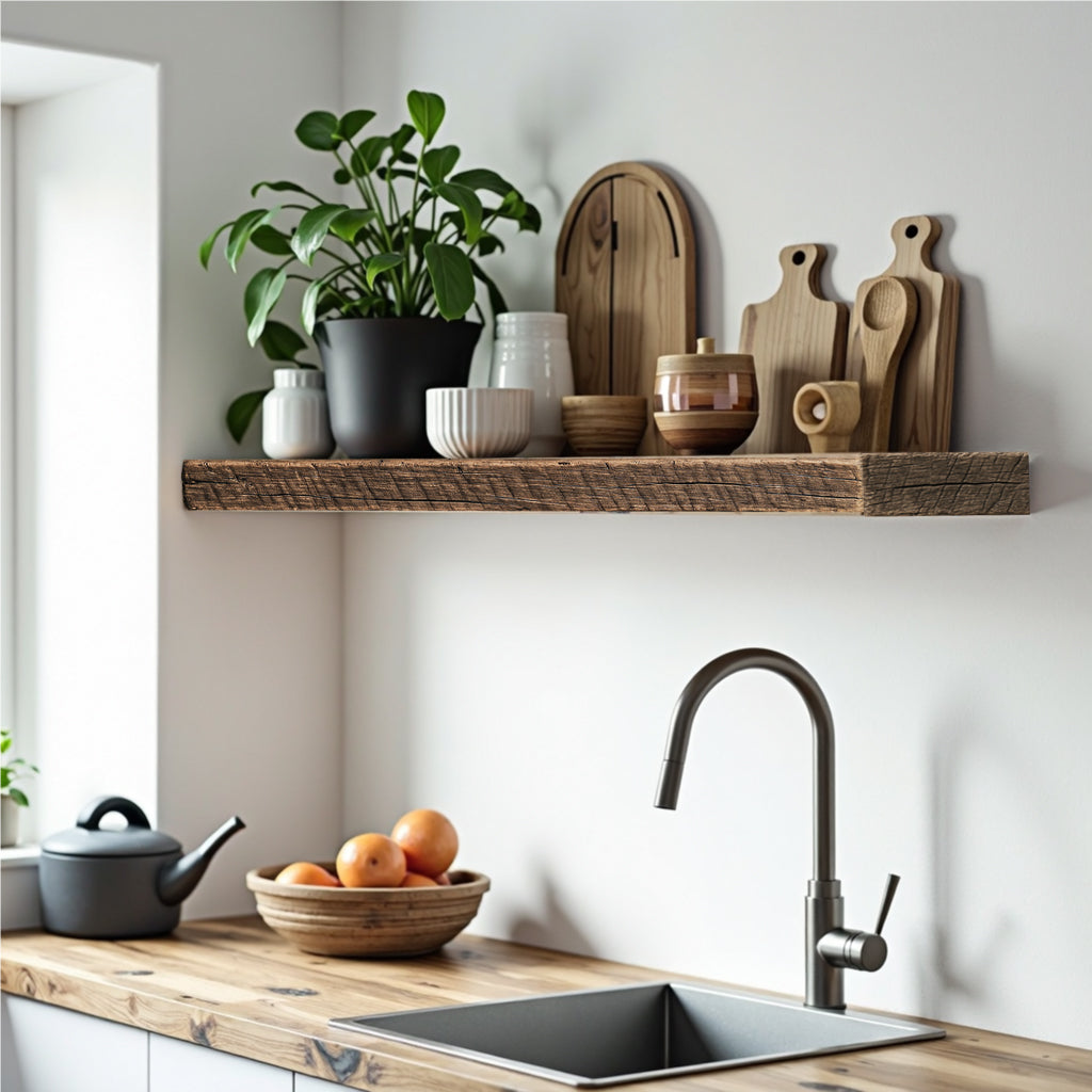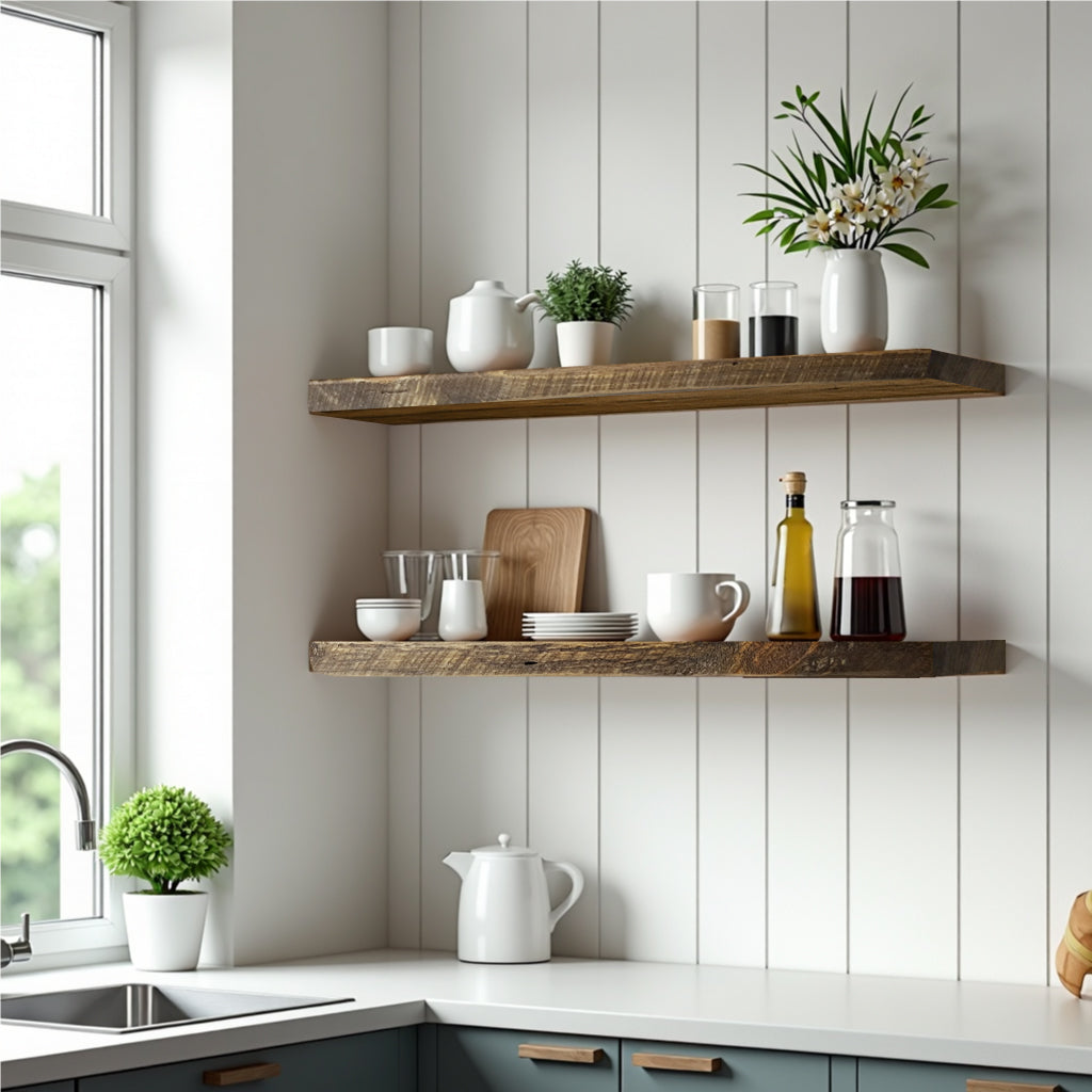 Reclaimed Barnwood Charm: Elevate your home decor with our floating shelves, crafted from reclaimed wood. This floating shelf has character only reclaimed wood offers, adding rustic charm.